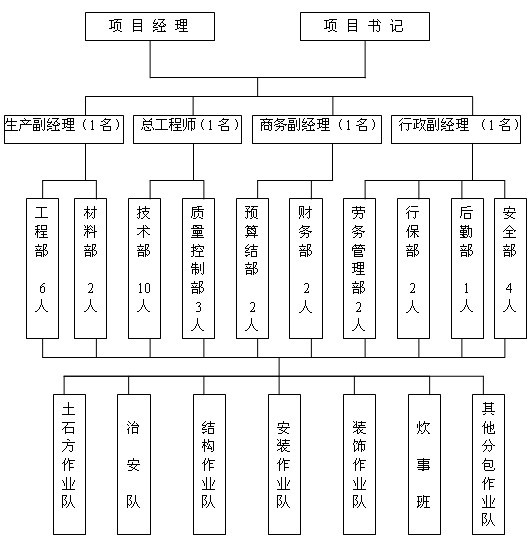 鉴于本工程的重要性,经单位研究决定,本项目经理部领导班子由项目经理、项目书记、总工程师及四名副经理组成,主管技术、质量、生产、安全、经营、成本控制和行政管理工作,并负责对工程重大事宜的领导、指挥、协调,决策。具体安排如下图: