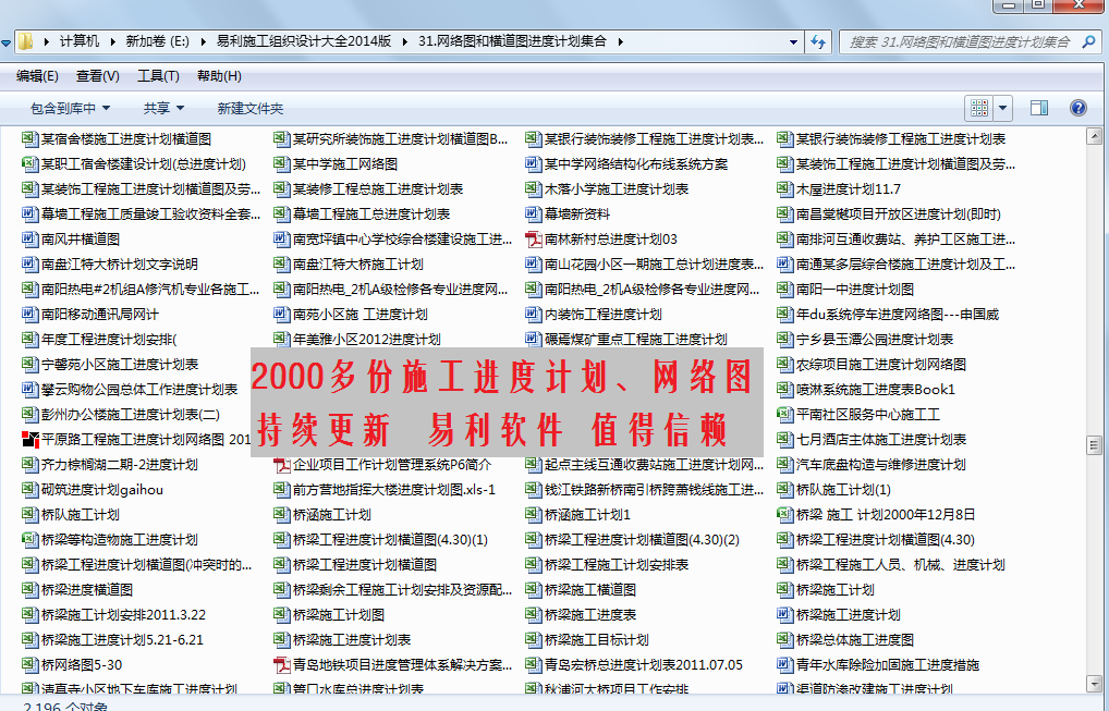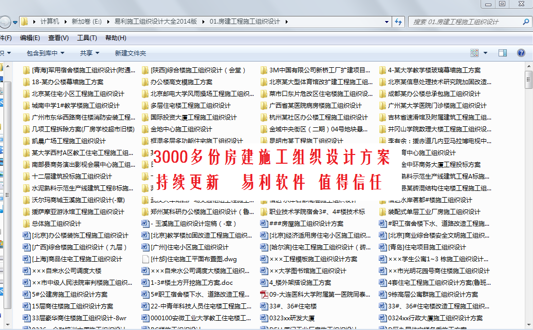 选择易利施工组织设计大全的理由!!!易利项目管理网是国内专业的正版技术标软件开发商,先后发布了易利项目管理软件(横道图、双代号网络图、进度资源成本跟踪、完美支持梦龙Project项目数据、上万用户使用)、易利平面图软件(被恒智天成、品茗软件先后模仿)、易利施工组织设计软件,并为广大用户提供了专业的施工组织设计大全2015版、易利建筑资料大全2015版(囊括建设工程施工组织设计大全图集大全、电子书大全、规范大全、图纸大全、智能建筑培训大全、建造师培训视频等,仅需898元)。我们会一如既往的提供专业的软件、资料与技术服务、免费升级。点击可以了解易利项目管理等技术标软件详情