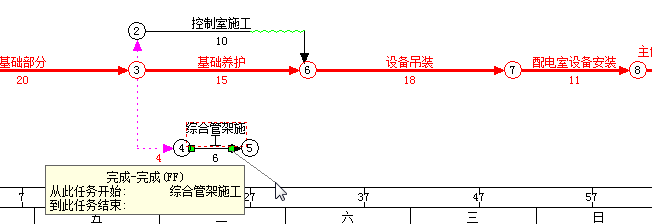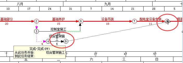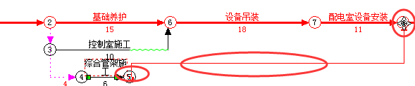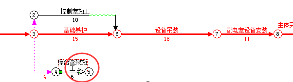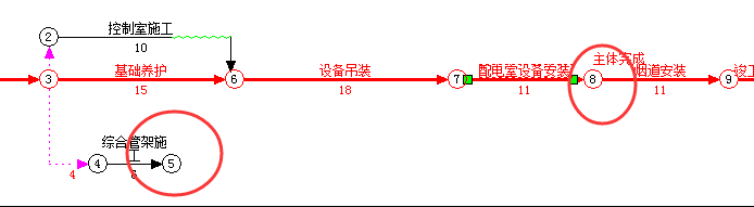 如下图。如果要修改成“配电室设备安装”和“综合管架施工”两项工作都完成后,才能进行节点8以后的内容。就要把下图中的节点5和节点8合并成一个节点。 |