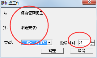 | 11、松开鼠标后,会弹出建立虚工作的对话框,也就是建立两个节点相关的工序之间的搭接关系,这里会默认计算出来间隔时间,可以修改为0. |