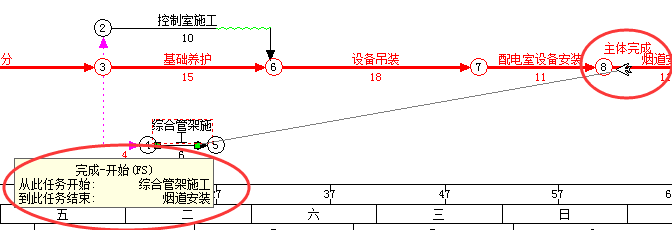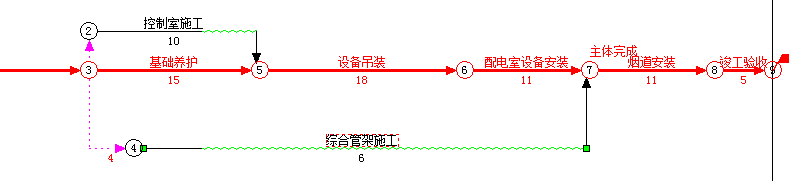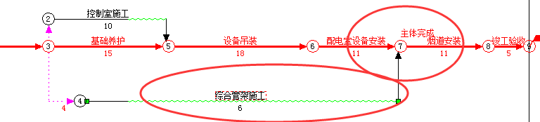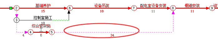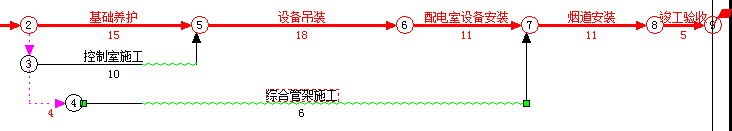 2、节点合并在网络计划中的实际意义是“配电室设备安装”和“综合管架施工”同时与"烟道安装"建立完成-开始的搭接关系。鉴于“配电室设备安装”已经建立关系,所以操作的关键是如何建立“综合管架施工”与“烟道安装”的搭接关系。