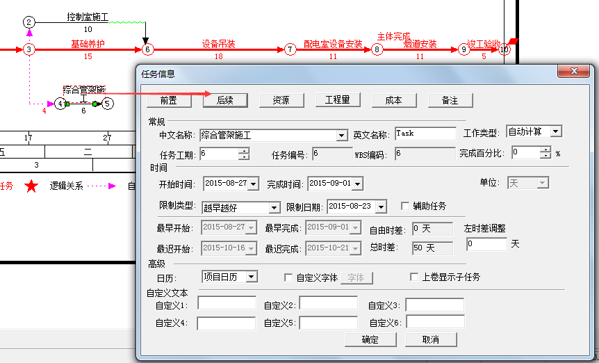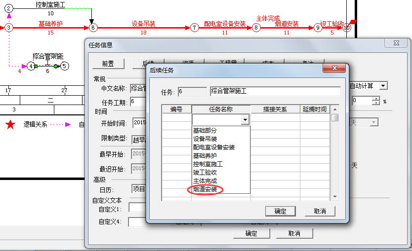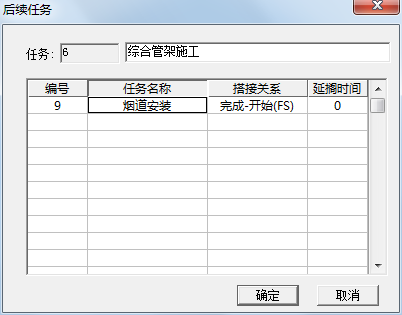 | 7、点击后续,在后续任务列表中点击任务名称列的空白行,在出现的下拉列表框中选择“烟道完成”任务,然后点击确定。 |