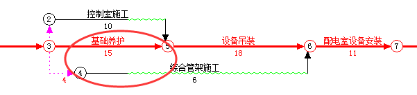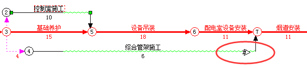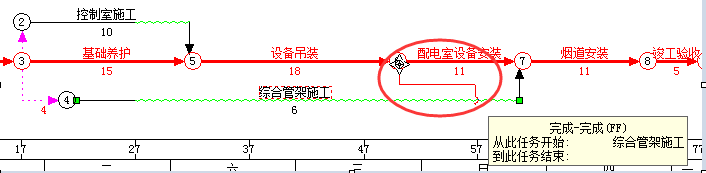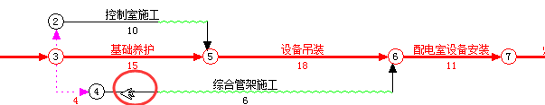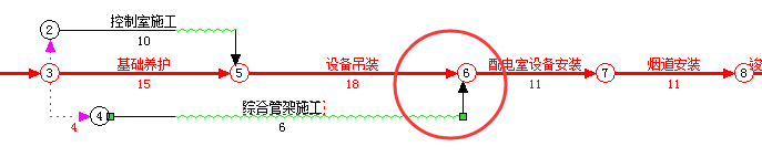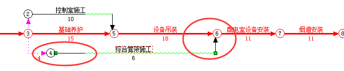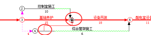 如下图所示,现在我们要把逻辑关系设置为“综合管架施工”完成之后,“配电室设备安装”才能开始,就需要将“综合管架施工”的结束节点。