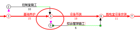 | 松开鼠标后,软件会自动将”综合管架施工“的开始节点调整到节点5了。此处因为”设备吊装“和综合管架施工”是并行任务,且共用了开始、结束节点,为了符合网络计划规范,软件自动生成了 |