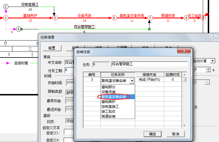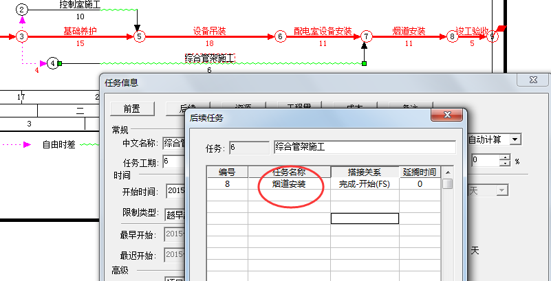 第二种办法:通过修改任务信息框的后续任务列表,将原有的”烟道安装“改为”配电室设备安装“,也会实现上图的效果。 |