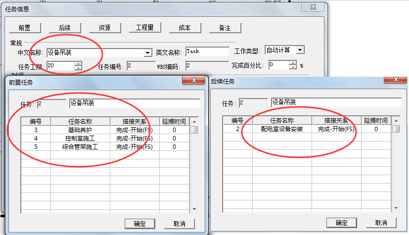 在任务信息框中分别点击【前置】和【后续】,可以看到软件已经自动为新建的任务创建好了与前后任务的搭接关系。
