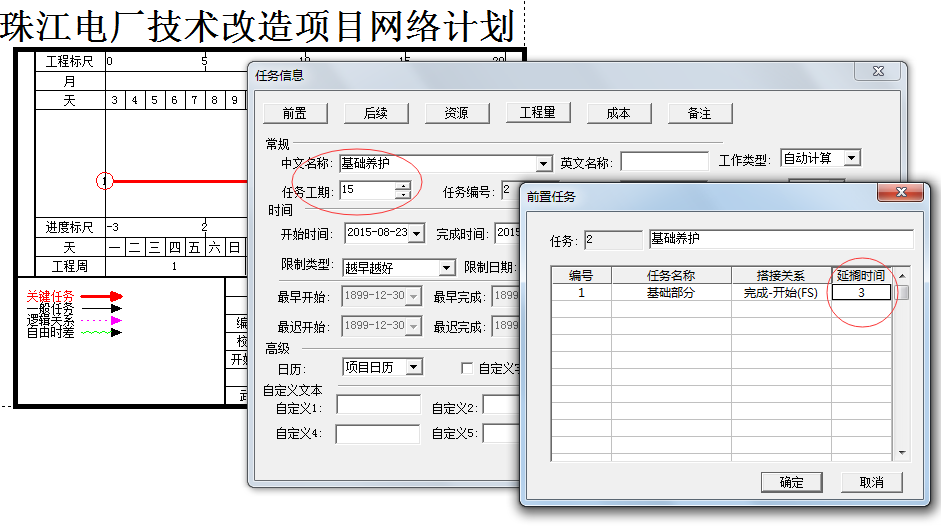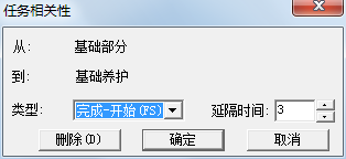 | 8、实际项目中经常会存在前置工作完成几天后后续工作再开始的情况,可以在新建任务信息框的前置任务列表中修改延搁时间,软件会自动根据搭接关系生成虚工作 |