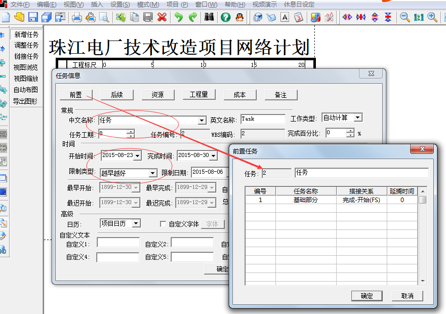 3、松开鼠标,软件将弹出新增工作窗口。在弹出的任务信息框中可以看到任务的限制类型是越早越好,且点击前置按钮弹出的前置任务列表中可以看到软件自动添加了与【基础部分】的完成开始关系。在此窗口中,一般仅需要修改工作名称和工期。因为开始时间默认是前工作结束之后马上开始,即前工作的结束时间就是后工作的开始时间。 |
