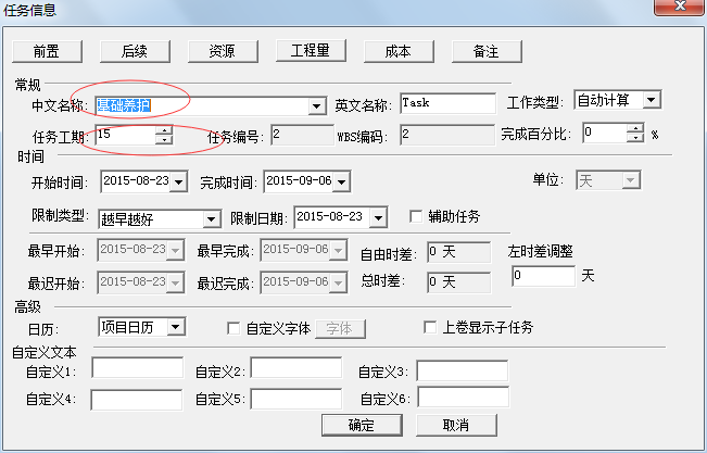 | 4、填写工作名称、工期,然后确定。 |