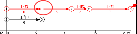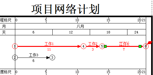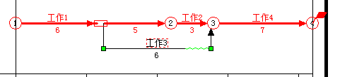 能看到在横道图中实际上是软件自动生成了一个摘要任务,名字叫工作1.工作1有两个子任务,这两个子任务是最终显示在双代号中的箭线。提醒:默认情况下摘要任务是不显示在双代号网络图中的。 |