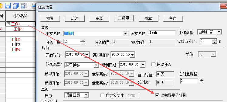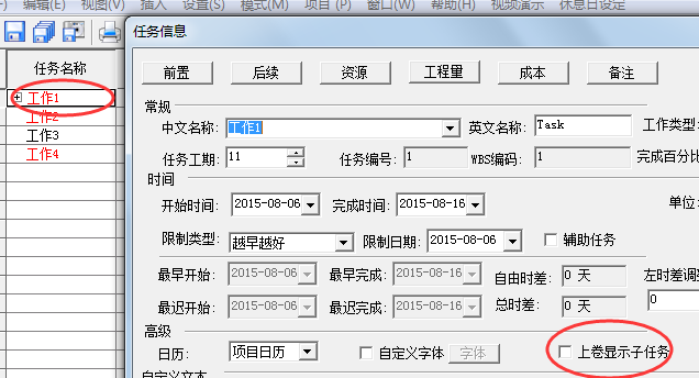7、进入摘要工作 【工作1】的任务信息框,可以看到该任务启用了一个特别的选项:上卷显示子任务。 |