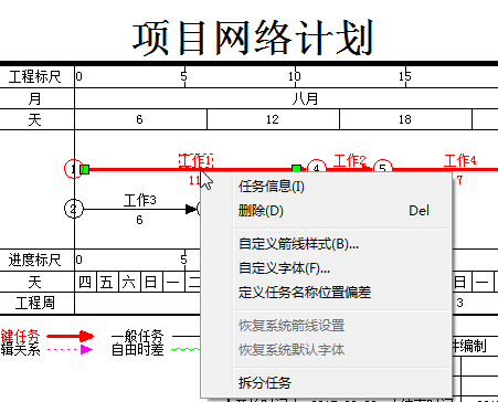 | 3、将鼠标移动到工作1的箭线上,单击鼠标右键,在弹出菜单中选择“拆分任务”。 |