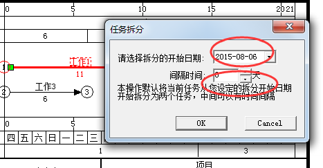 | 4、此时,弹出任务拆分设置对话框。拆分开始日期为从哪一天开始进行拆分,间隔时间为拆分后的两个任务之间的间隔时间。 |