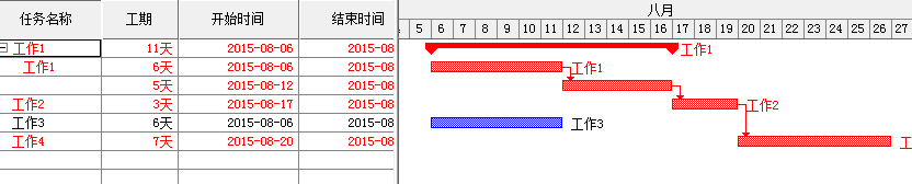 | 5、选择日期为2015年8月12日,然后点击ok。可以看到工作1被拆分成为了两个任务,左边6天,右边5天。软件默认给右边任务设置了一个空的任务名称。 |