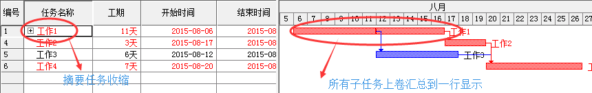 8、该选项有两个效果。在双代号会采用组件方式来显示下属的子任务。在横道图中当摘要任务收缩起来时,会将所有子任务汇总显示。如下图 |