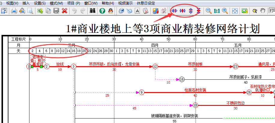 软件可以自动适应用户设置的打印纸张,默认为A4 横向。可以通过右键菜单的自适应打印纸张来设定。默认情况下软件将会根据任务的数量、任务名称、项目总工期自动计算所需的日历刻度和任务行高,并且会自动将任务名称换行显示。